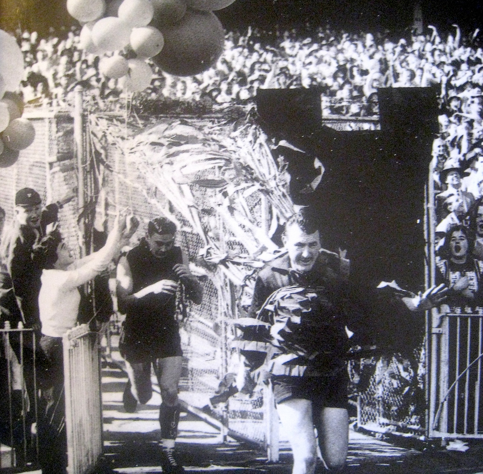 But first to where it all began…back to the days of black and white photography. With streamers covering the players race as the Red Legs take the field in the 1957 Grand Final, Ronald Barrassi is the player ducking the streamers, perhaps the first player to superstitiously avoid the runthrough banner?