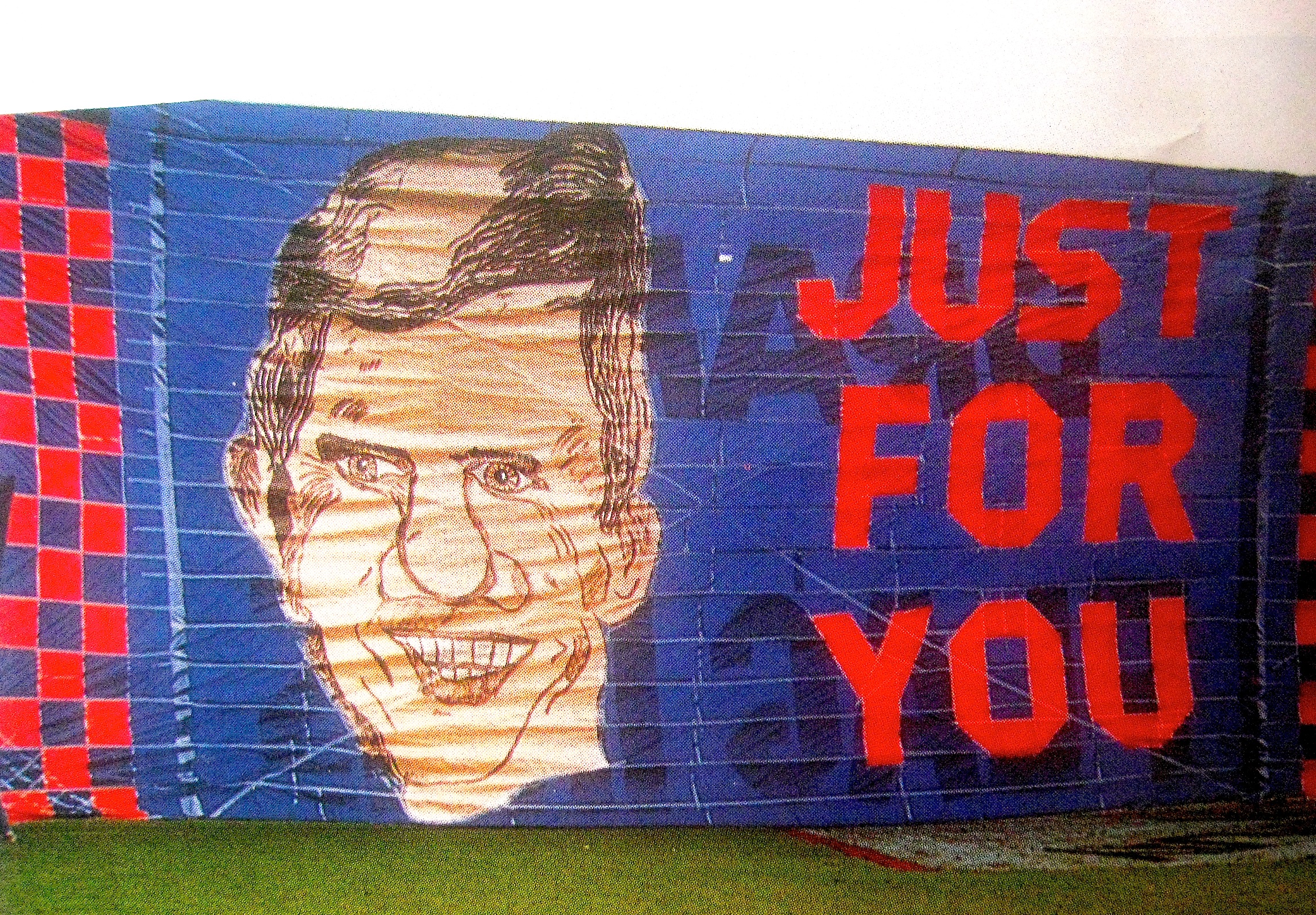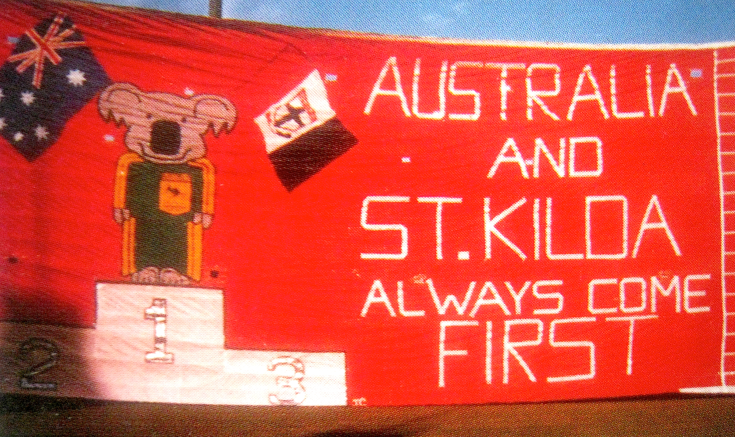 Another cheersquad to have had a ‘seniors’ moment was that of St.Kilda. Obviously taken with the Olympic games of 1984, this banner gives us a rather inflated view of the footballing world as we know it.