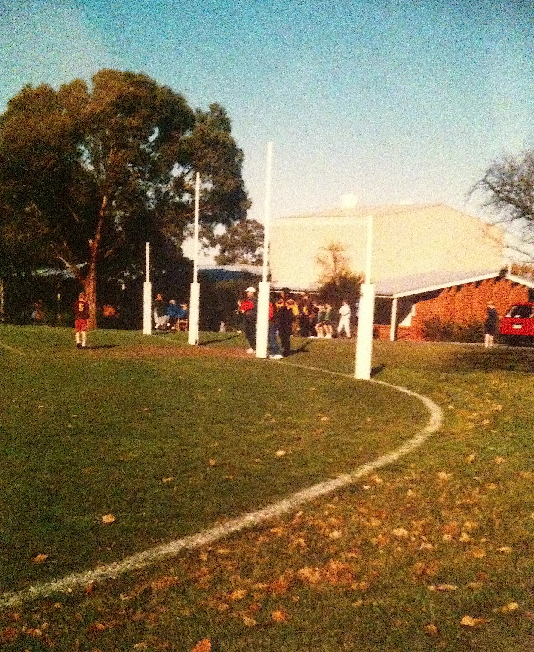 Playing at Kingwsood College was a treat. As you can see in the photo below, they had boundary lines! Not just that, thick, obvious ones. At Blackburn we had to run out witches hats before a match. And look at those padded goal posts! Ours were big hunks of tree wedged into the rock hard and at times gravelly surface. It seemed a fitting grand final venue.