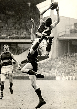Do you remember when you were a kid and your imagination wasn’t limited by the laws of physics, gravity and the like? The above drawing by my little brother Pete embraces this freedom in creativity as he imagined his Footscray hero, Danny Hargraves, floating above the pack and plucking a grab in the square. I have to say it also bares a remarkable likeness to the famous mark by taken by Footscray’s Merv Hobbs in the 1961 preliminary final.