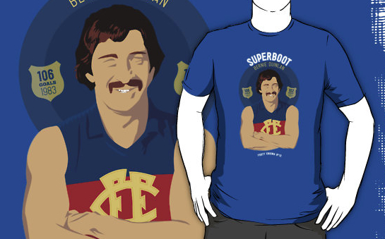 As the name suggests, this isn’t the ‘A-list’ of VFL stars; the Harts, the Jesaulenkos and the Keith Greigs. (I know, there was only one of each, but I just love this ‘footy-speak’) Rather, these t-shirts celebrat the cult heroes, with the odd champ thrown in for good measure. So dust off your old footy cards and compare notes as we take a look at the players chosen, one from each old VFL club, in club-by-club alphabetical order.