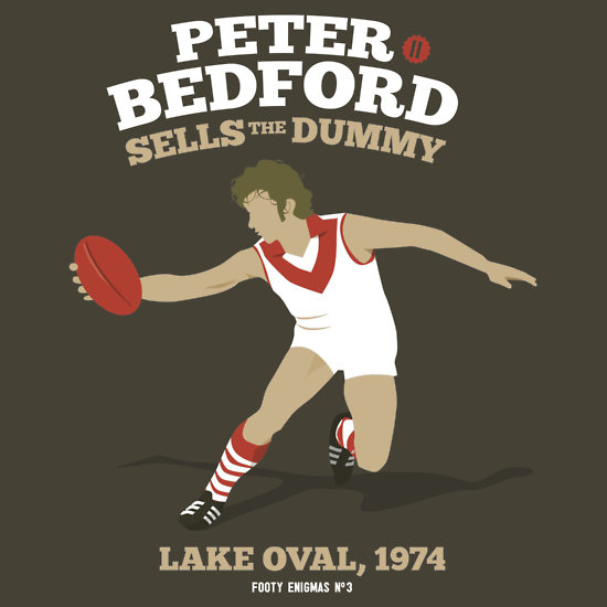 “I have Bedford’s 1974 and 1976 footy cards. I have always been impressed that he struck the same lairy “selling the dummy” pose. (see below) I don’t recall seeing him play but as a Brownlow medallist and Shield cricketer he commanded respect anyway.”