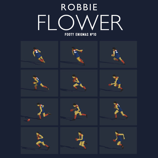 “Robbie Flower stood out clearly as the man to represent the Dees. No still picture seemed to convey the essence of Flower which to me was his run. So I went back to YouTube and drew a sequence of 12 little Robbies.”