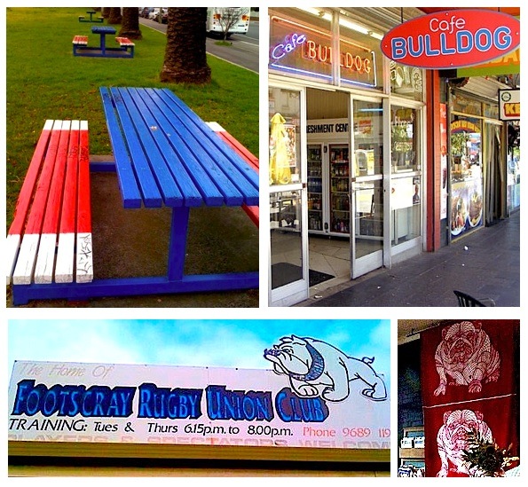 ‘Cafe Bulldog’ in the Footscray Mall unashamedly sports the clubs logo and colours, as does the trendier Gusto cafe in West Footscray, albeit with a somewhat artfully put together Bulldog to watch over patrons. (bottom right pic from the wonderful Footscray Food Blog-read here about the Whitten Oval’s Pound cafe!)