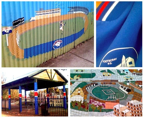We’ll skip momentarily out of Footscray, yet stay firmly in the west. The Braybrook Hotel proudly houses these fantastic statues of two Braybrook boys in EJ Whitten and Hawkins, arguably Footscray Football Clubs biggest personalities and two of the very best. Surely there’s no need for security with these two out the front night after night?Below is another wall mural, this one running along the Barkley Street side of St.Monica’s Primary School. The scoreboard reads Footscray 18.24.132 to Collingwood 11.10.76. If only that were the case more often than not! We also see that Footscray Primary’s uniform is red, white and blue, and back to the mosaic wall for another take on the Western Oval, along with a Bulldogs inspired playground.