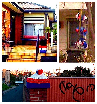 Many houses are adorned with Footscray Footy Club paraphernalia, and when the Dogs are in the finals as they were recently the volume increases dramatically. Above are some of my favourites. From the subtle to the clever. The lower picture was found on Lara Cameron’s lovely blog http://kirinote.blogspot.com.au/2009/09/knitted.html