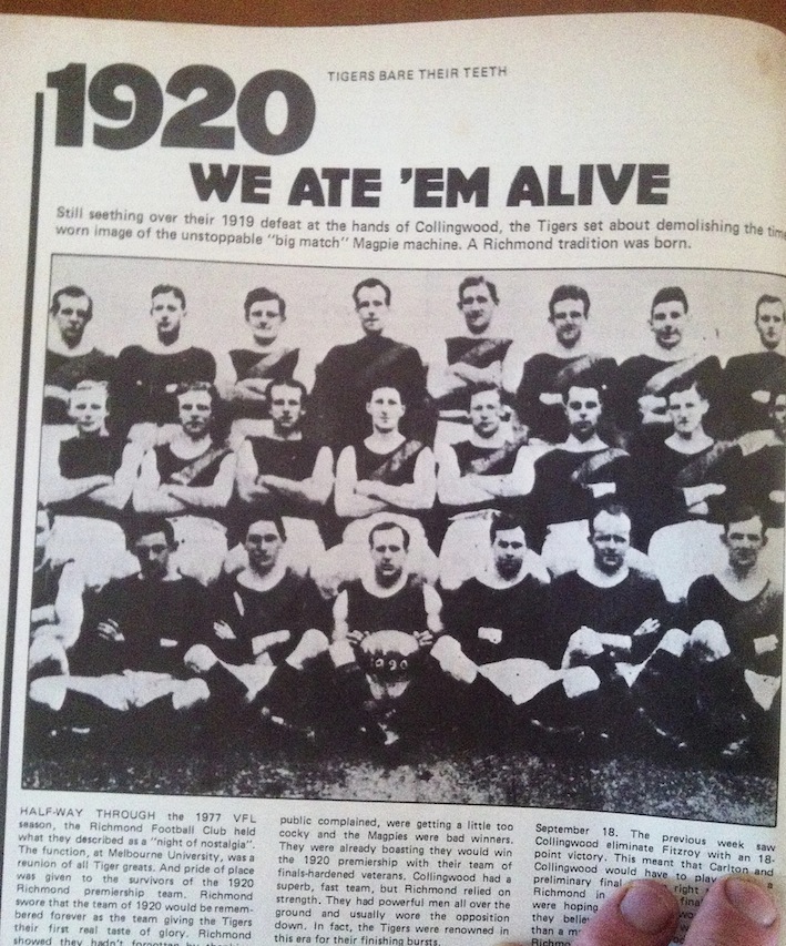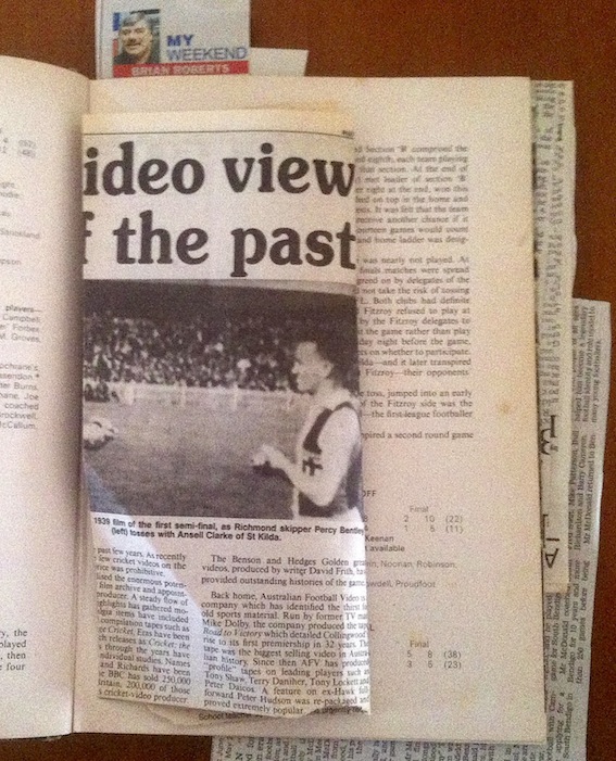 The following morning we trekked back to Richmond to revel in being in Richmond if that makes any sense. We went to my parents for dinner to share in the premiership festivities with my dear old dad in particular, a Tiger of old, the fourth cog in a six-generation Tiger machine. After dinner we looked through his mum’s old scrapbooks, 1958-1969. Dad has some sort of story for every game we looked back at. This was truly a magnificent way to mark the premiership.