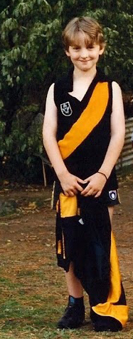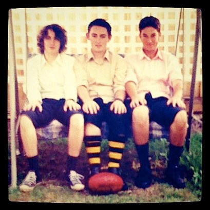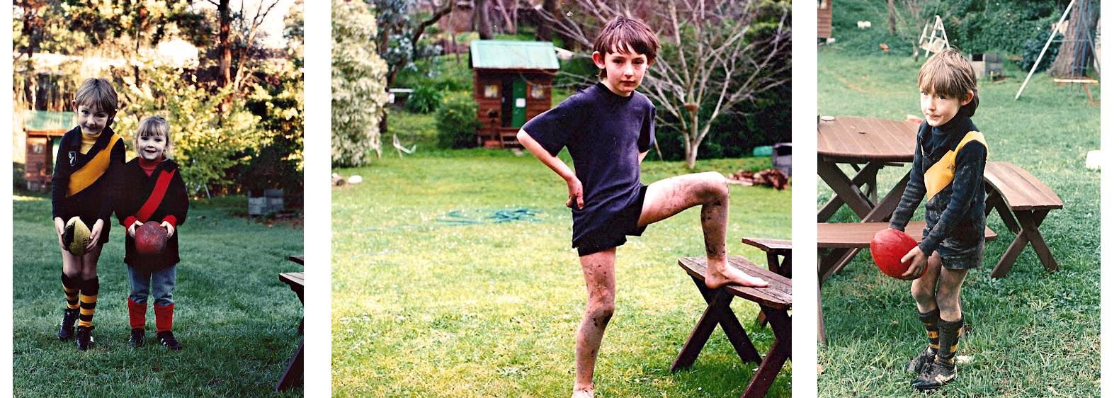 It was often said to me as a kid that the muddier you got, the better you had played. I must have been a bit of a star then! Yep, that’s my sister Mezz and I. Mum did the unthinkable and tried to convert her to Essendon, but she had the sense to follow the family team, and the sash was soon a yellow one. I enjoyed playing footy with my lil’ sister, and I had her kicking really well, but her heart just wasn’t into playing. I had a dream to play for Richmond. That was sadly not a reality for her so why bother? What I needed was a mind for moulding. Thankfully, my footy mad baby brother came along.