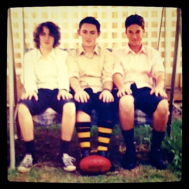 Three things about this photo. Firstly, I cannot work out if I am wearing long shorts or short longs, but they do lend a certain early 1900’s knickerbocker feel to the photo. Secondly, it’s clearly a staged photo as can be seen by the limp ‘effort’ i am putting in. Our game was not so much about high flying either, rather marking ‘tussles.’ And thridly, it reminds me of finals time. Spring leaping through the trees and the smell of cut grass. I can smell this photograph.